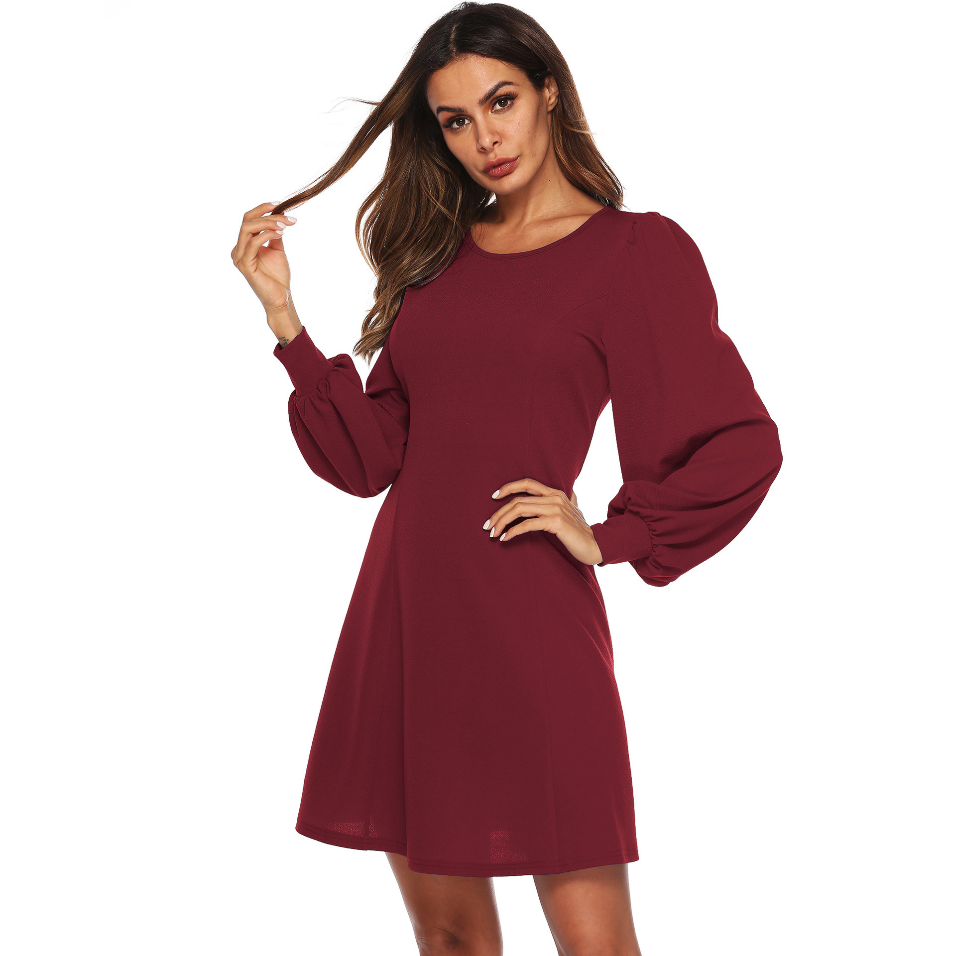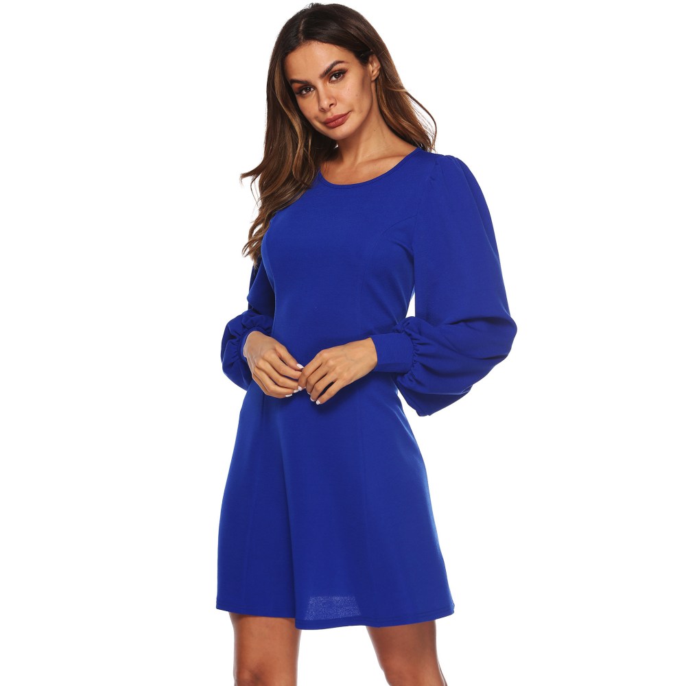 New Dress Female Long Sleeve Slim Autumn and Winter High Collar Lantern Sleeves Solid Color
