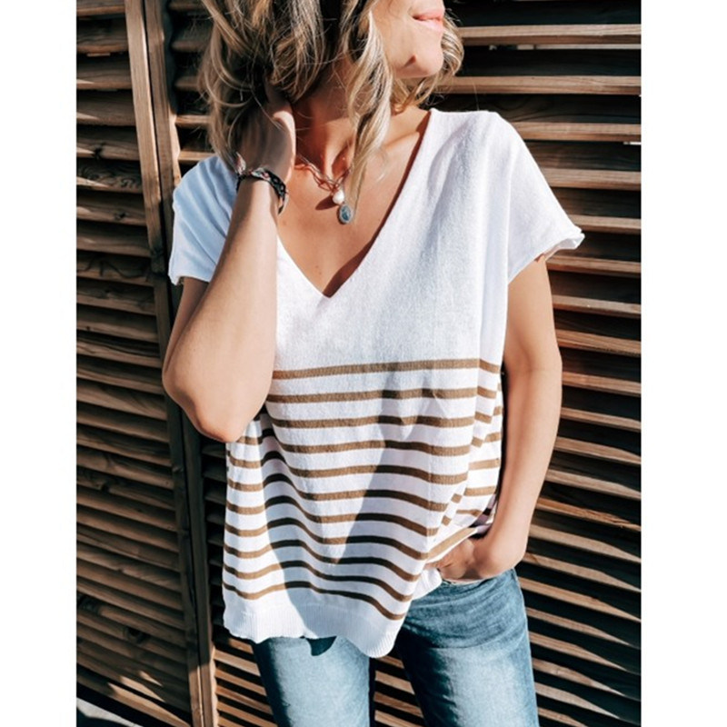 Discover the chic elegance of the Temperament New Women's Summer V-Neck Striped Knitted Thin Top. This stylish top effortlessly blends modern design with casual comfort.